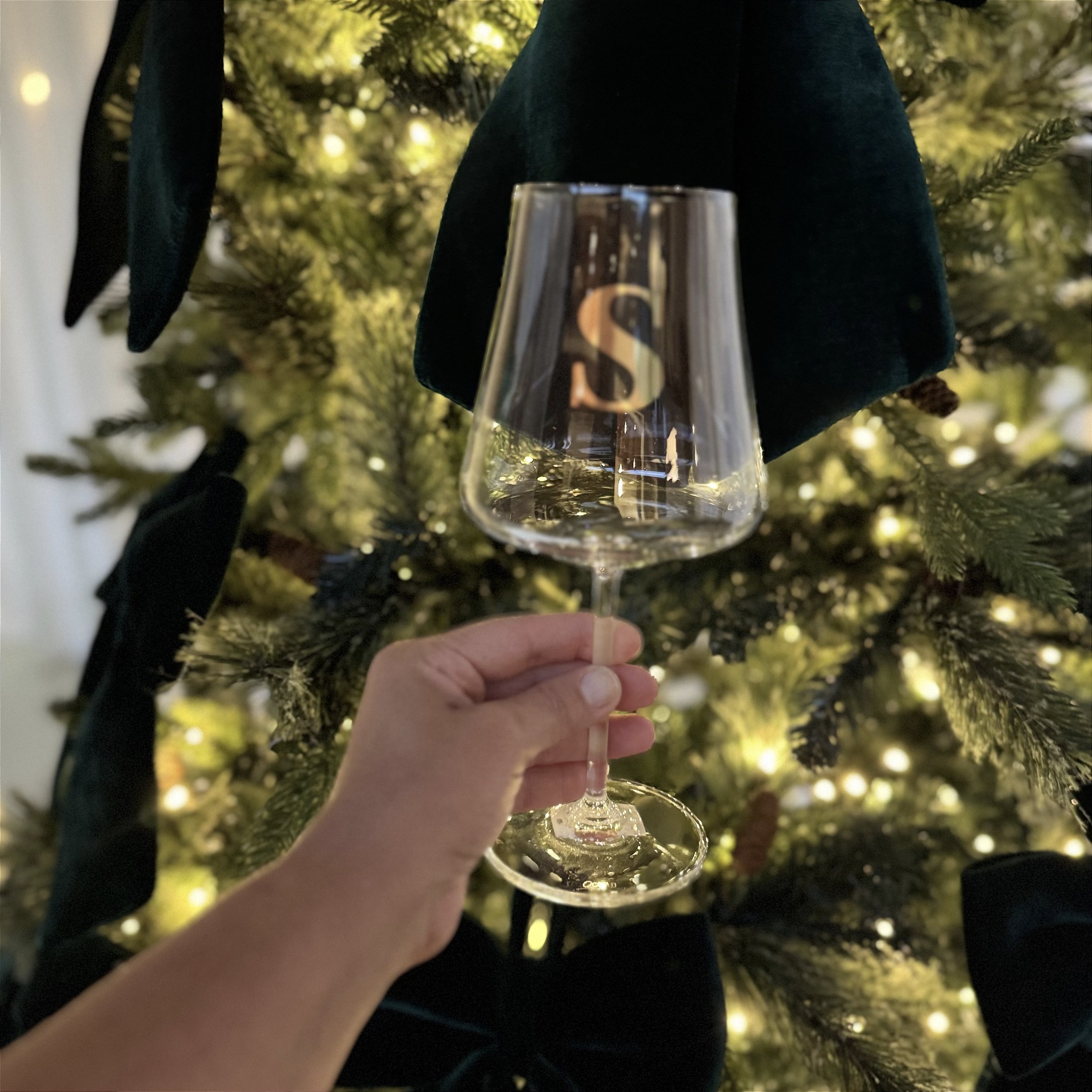 Cada taça é personalizada com a inicial do seu nome em ouro, gravada com acabamento refinado que reflete elegância em cada detalhe — um verdadeiro presente de sofisticação e afeto.